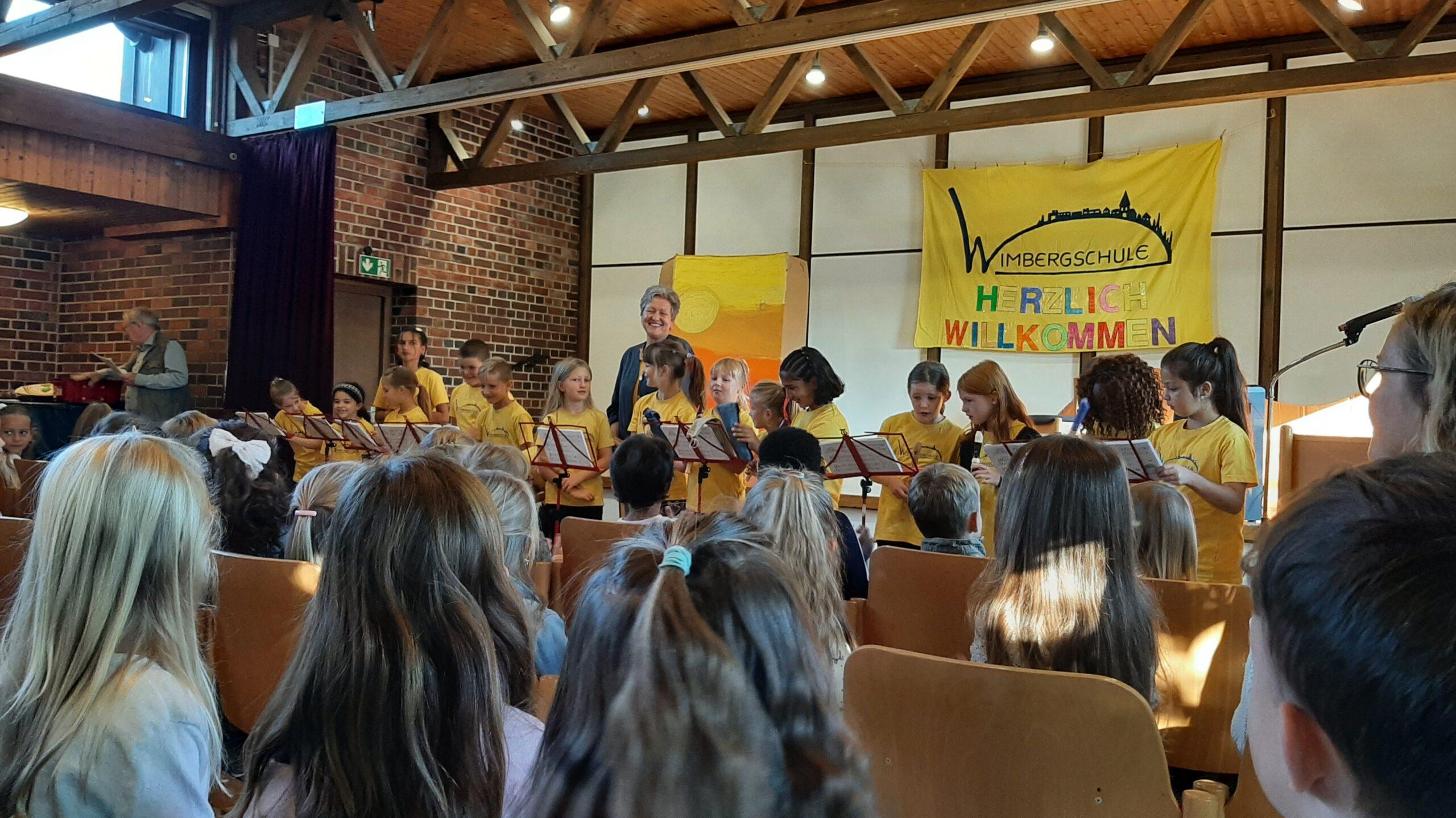 In der Einschulungsfeier sollten die Kinder der ersten Klasse so richtig Lust auf die folgenden vier Jahre an ihrer Schule bekommen, denn die Klassen der Grundschule Wimberg zeigten ein vielfältiges Programm, um ihre neuen Mitschülerinnen und Mitschüler willkommen zu heißen. Jürgen Müller als stellvertretender Schulleiter begrüßte ca. 160 Gäste und über 40 Schulanfänger und Schulanfängerinnen im evangelischen Gemeindehaus der Bergkirche, fesselte sie mit einem Zahlentrick und gab ihnen gute Wünsche mit auf den Weg.